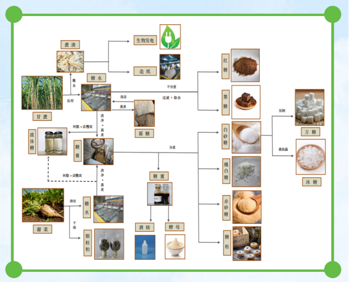制糖工藝微展示:通過制糖工藝流程簡圖展示食糖從甘蔗、甜菜通過壓榨、澄清、分蜜、結晶等物理工藝流程制成食糖的過程。